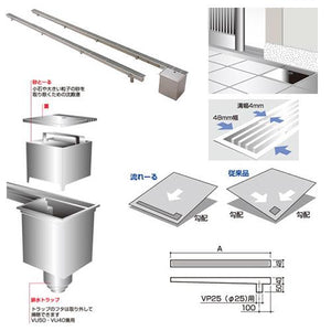 ●砂も取る※排水トラップ付です。●仕上が美しい美しいステンレス製。幅48mmと目立たないので、玄関の美観を損ないません。溝幅も4mmと狭く、排水溝のイメージを一新しました。(トラップ付の場合、フタの指穴は直径14mmあります)●快速排水長い排水溝で一気に排水します。「溝」で排水するので、排水量が増えました。(メーカー比) 土間勾配も1方向ですみます。 ●幅広い用途に玄関の中だけでなく、屋外にも使えます。