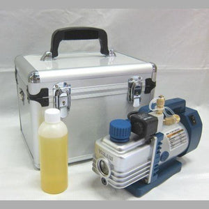 ●サイズ(本体): W88×H155×D240mm ●内容量(オイル):230ml ●質量:6.0kg ●電源:AC100V 50Hz/60Hz ●ステージ:2ステージ ●真空到達度:15ミクロ(2Pa) ●モーター:150W/2ポールモーター ●吸気管径:5/16フレア(1/2-20UNF)、1/4フレア(7/16-20UNF)●オイル封入量:150ml ●使用温度:7℃~40℃